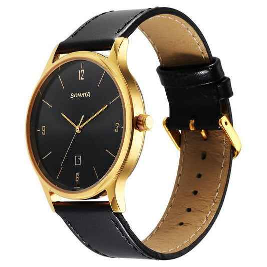 Fastrack Leather Sonata Quartz Analog with Date Black Dial Watch for Men-77105Yl03
