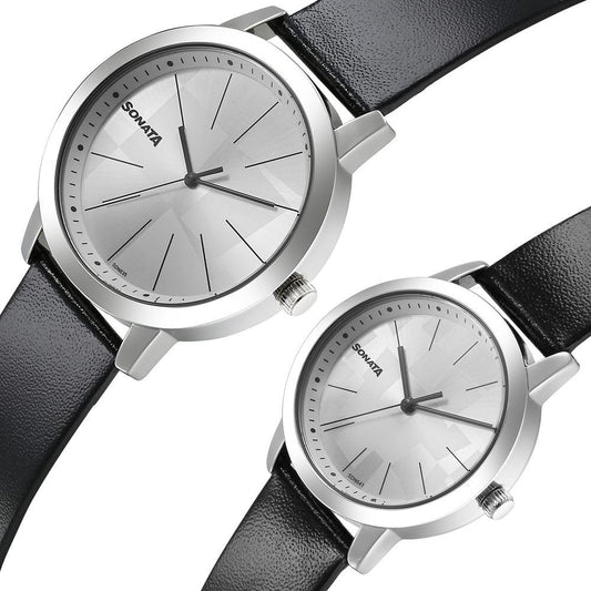 Sonata Pairs Quartz Analog Silver Dial Leather Strap Watch for Couple-NS7712887047SL01P