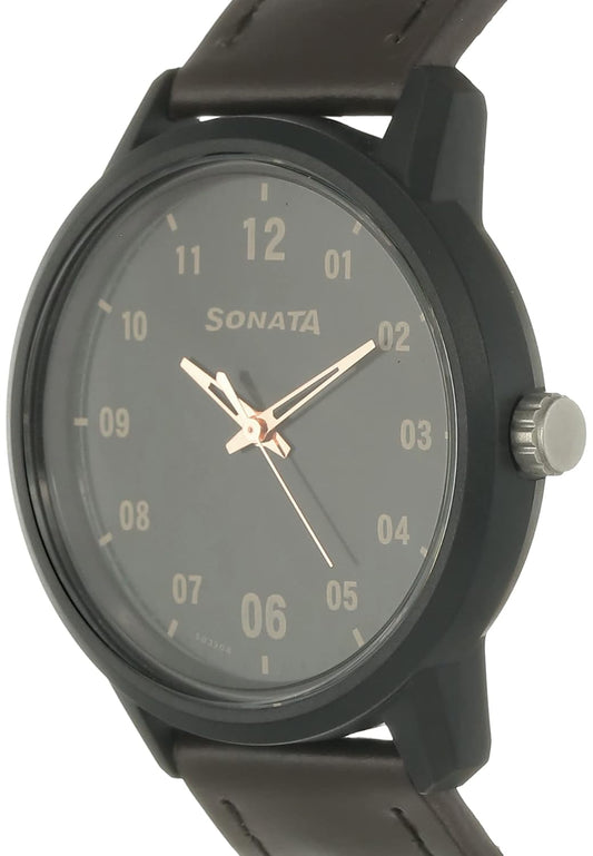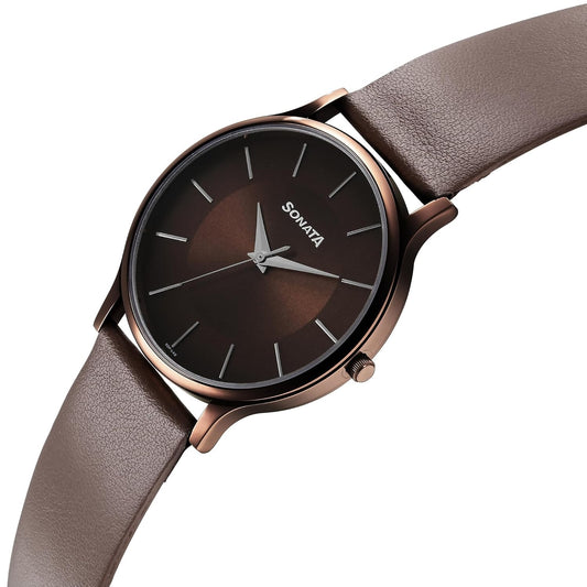 Sonata Aspire Quartz Analog Brown Dial Leather Strap Watch for Men-NS77105QL02W