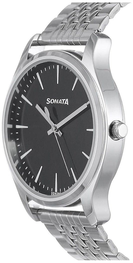Sonata Quartz Analog Black Dial Stainless Steel Strap Watch for Men-NS77082SM01