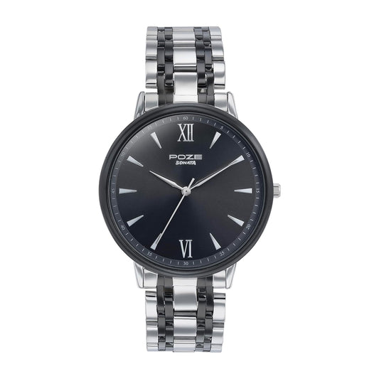Sonata Poze Quartz Black Dial Silver Metal Strap for Men-SP70044KM02W