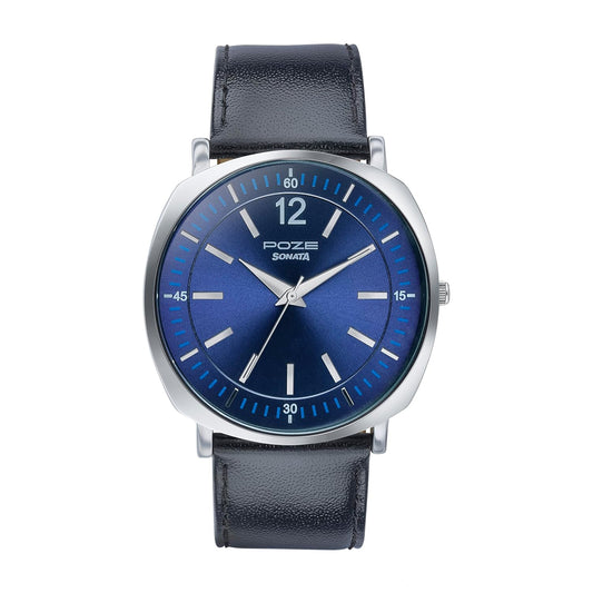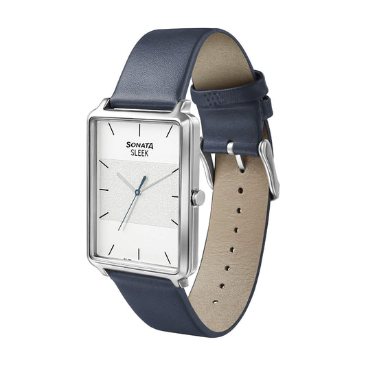 Sonata Quartz Analog Silver Dial & Blue Band Leather Strap Watch for Men-NS7144SL01