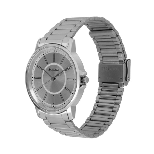 Sonata Quartz Analog Grey Dial Stainless Steel Strap Watch for Men-NS77083SM05W