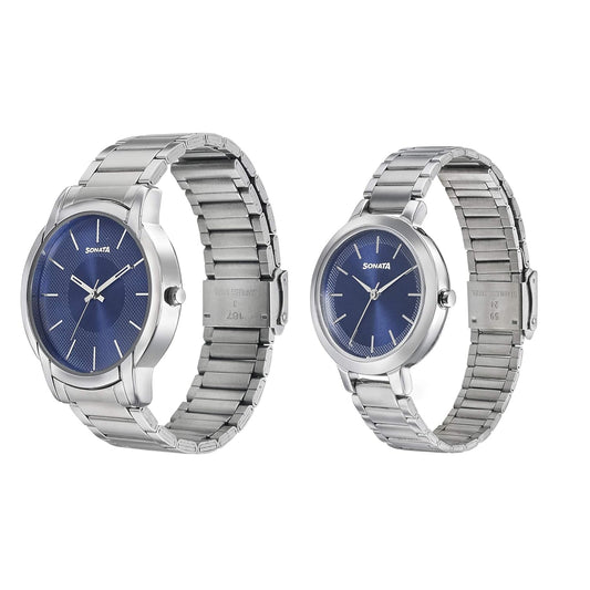 Sonata Quartz Analog Blue Dial Metal Strap Watch for Couple-NS770318141SM01P