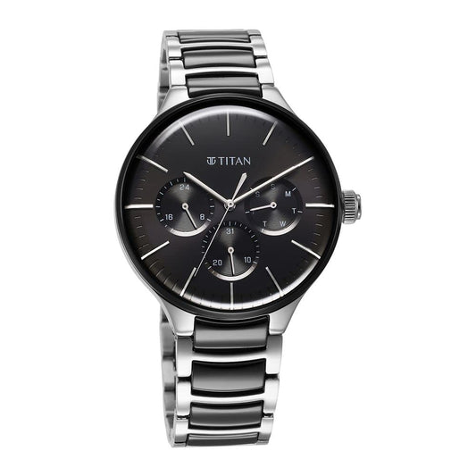 Titan Ceramic Fusion Quartz Multifunction Black Dial Silver Dual-Toned Stainless Steel Bracelet Watch for Men-NS90148KD01