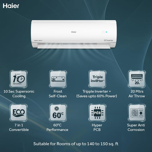 Haier 1.5 Ton 5 Star Triple Inverter Split AC (4850 W, Copper, 7 in 1 Convertible, 4-Way Swing, Frost Self Clean, HD Filter, Cools at 60°C, 20 Mtr. Air Throw - HSU18K-PYSS5BN-INV, White)