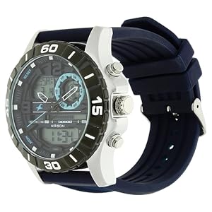 This watch features a grey round ana-digi dial, with Arabic numeral indices indicating hours, and minute markings on the bezel, all at 15-minute intervals. The dial has several small digital displays to show the date and day in digital format, along with buttons on the sides to adjust those features. The dial is enclosed in a stainless steel case. The watch can be fastened with its blue patterned silicon strap and buckle clasp. The watch offers a resistance to water up to 5 ATM.