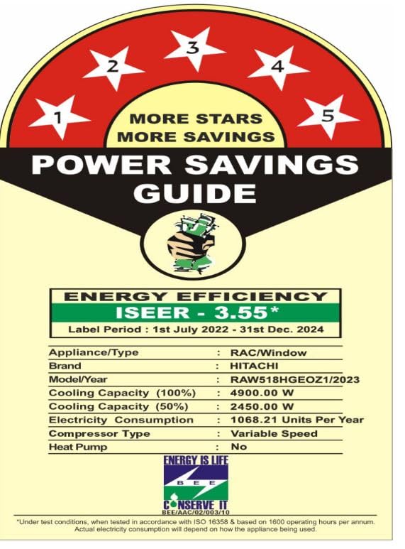 - Energy Rating: 5 Star: Best in class efficiency | Annual Energy Consumption (as per energy label): 1068.21 units | ISEER Value: 3.55 The star rating is as per BEE guidelines